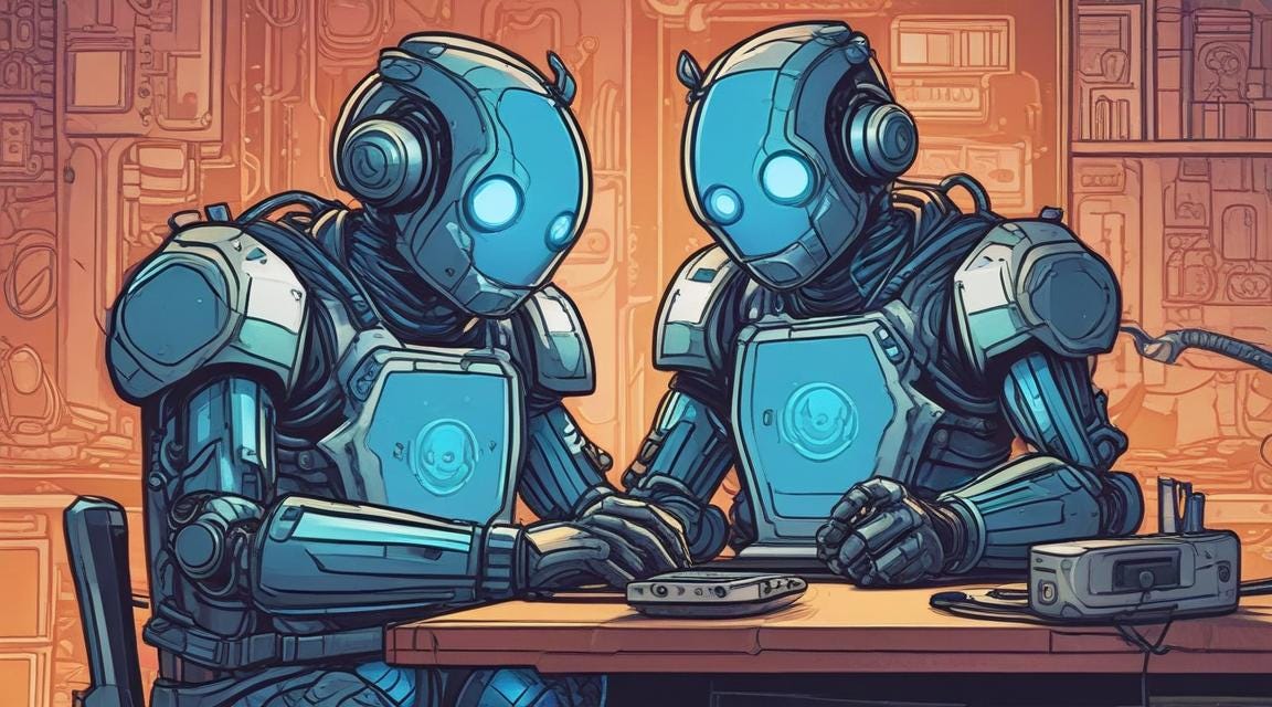 Left bot: “Hi.” Right bot: “Hello.” SoftBank: “Wow, we’ll write a check.” (Illustration: AI generated.)