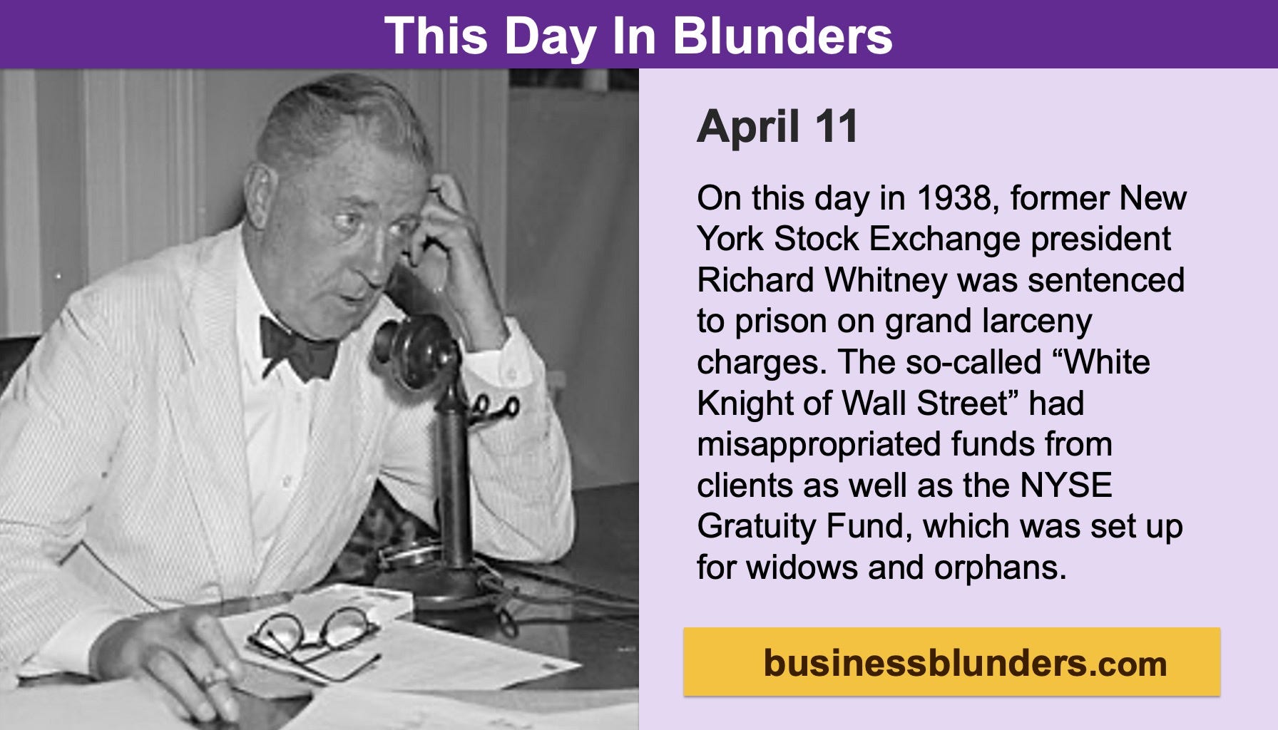Ricard Whitney preached self-regulation for the stock market. He could not even regulate himself. Read More: Richard Whitney – New York Stock Exchange (Business Blunders Hall Of Shame)